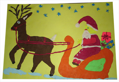 Mama napisała: Małgosia zrobiła 2 prace. Jednego mikołaja namalowała kredą na tablicy i przykleiła mu brodę z waty, a drugiego mikołaja namalowała razem z bałwankiem i choinką. Na drugim obrazku mikołaj ma głowę zrobioną z wacika (na głowi Małgosia namalowała mu garnek, bo powiedziała, że czapki jeszcze nie umie malować) a bałwanek jest cały z wacików. Śnieg Małgosia zrobiła pastą do zębów. Gdy obrazek wysechł namalowała mazakiem śnieżynki.