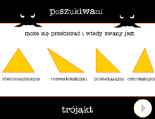 Zabawa dla starszych przedszkolaków i uczniów klas młodszych. Uczymy się rozpoznawać figury geometryczne. Trzeba pokolorować kwadraty, trójkąty i prostokąty na odpowiedni kolor. Pozostałe miejsca zostawiamy puste. Źle zaznaczone figury po sprawdzeniu mają kolor czerwony i można je poprawić.